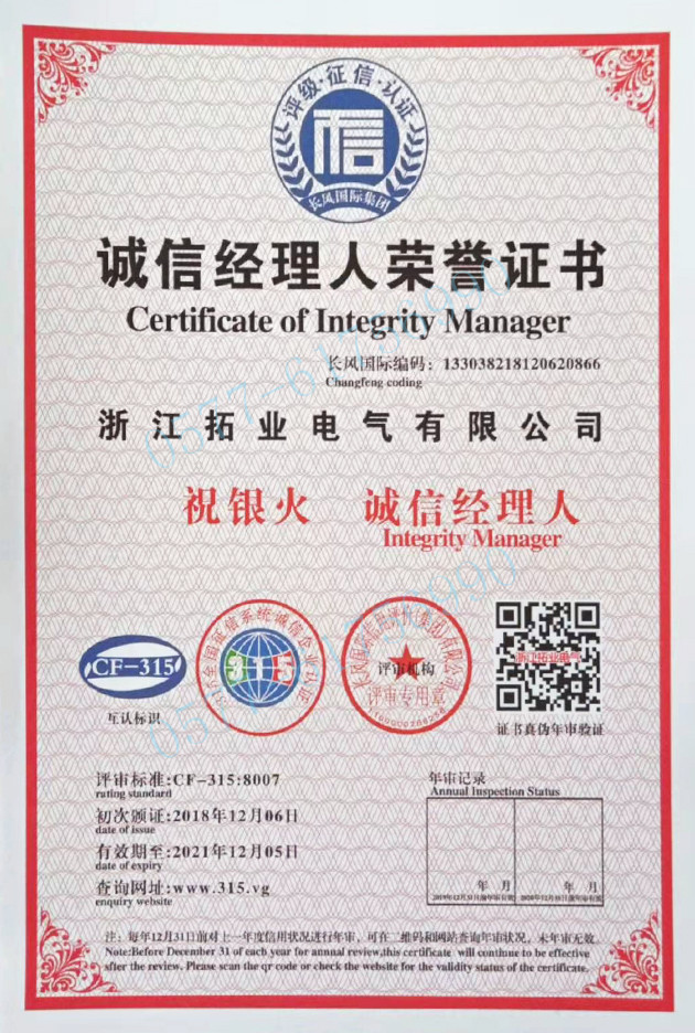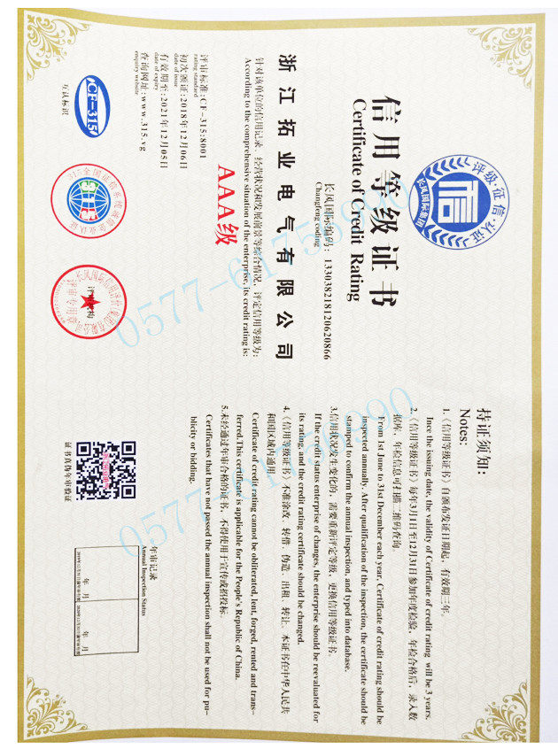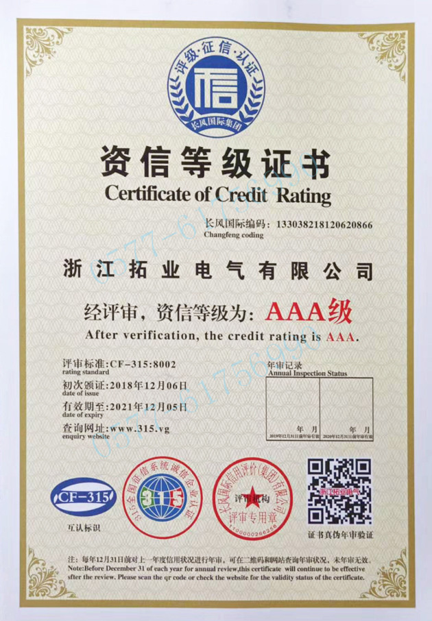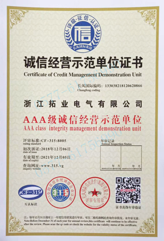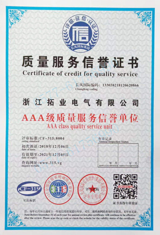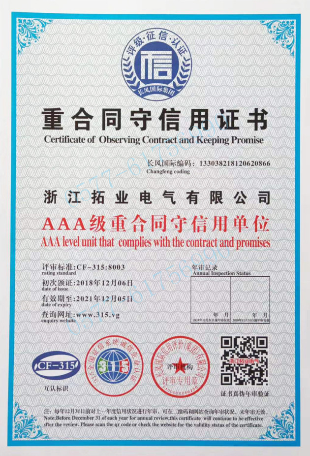 拓業(yè)電氣公司技術(shù)力量雄厚,工裝設(shè)備先進(jìn),并已獲得多項(xiàng)體系和產(chǎn)品強(qiáng)制體系及檢測(cè)認(rèn)證,公司以"精細(xì)化、嚴(yán)謹(jǐn)化、專業(yè)化、智能化"等創(chuàng)新工藝為標(biāo)桿,以"專業(yè)-精益"之推進(jìn),立足浙江、面向全國和走向世界,為致力于打造智能電網(wǎng)設(shè)備優(yōu)秀品牌而不懈努力和奮斗。